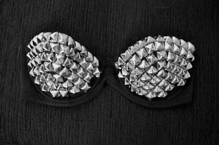 5. Space the gold spikes evenly in each row and use dabs of hot glue or super glue to secure each spike onto the jacket.